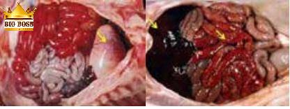 Ruột non bị viêm xuất huyết sâu và rất nặng. Máu ở động mạch bụng ứ đọng nhiều. Đặc biệt là đoạn giữa môn vị dạ dày đến không tràng dài khoảng 14cm có màu đỏ thẫm hoặc màu cà phê và cũng từ không tràng đến gần ruột thừa khoảng 20 -30 cm cũng có biến đổi như vậy. Toàn bộ đường ruột bị viêm xuất huyết nặng đỏ thẫm đến tận hậu môn.